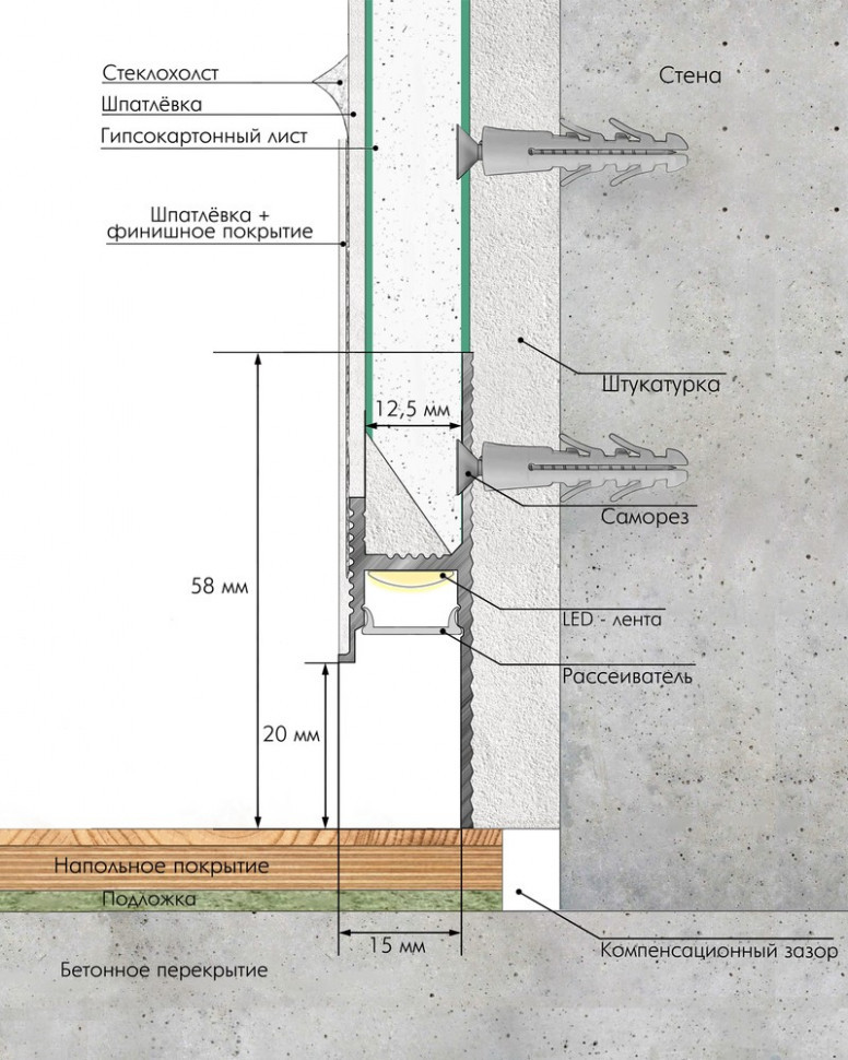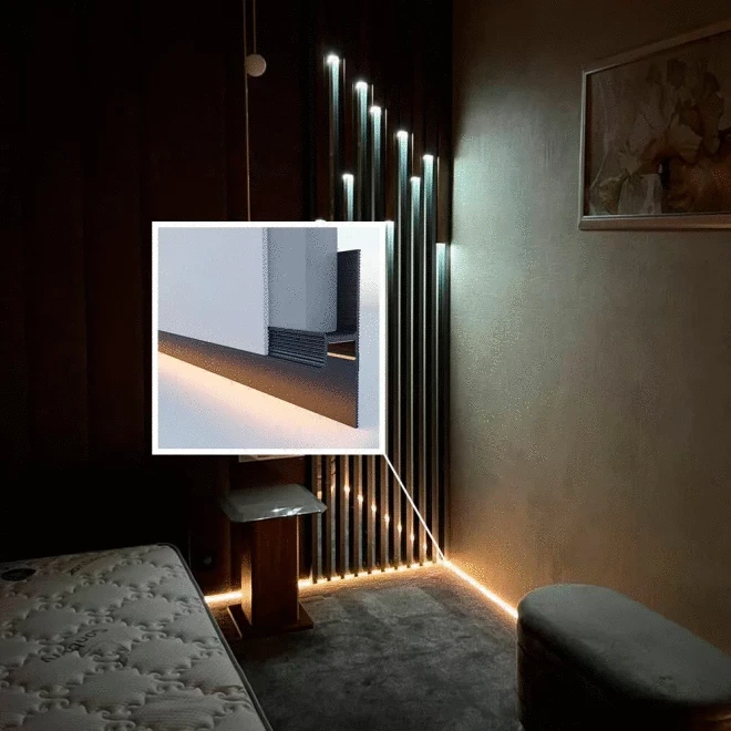 Теневой плинтус создаёт возможность гармоничного сопряжения цветов пола и стен, сглаживает момент стыка, даже если имеются какие-то неровности. Среди преимуществ такого решения отсутствие монтируемого плинтуса, который обычно создает неудобство при расстановке мебели, не давая ей вплотную прилегать к стене.