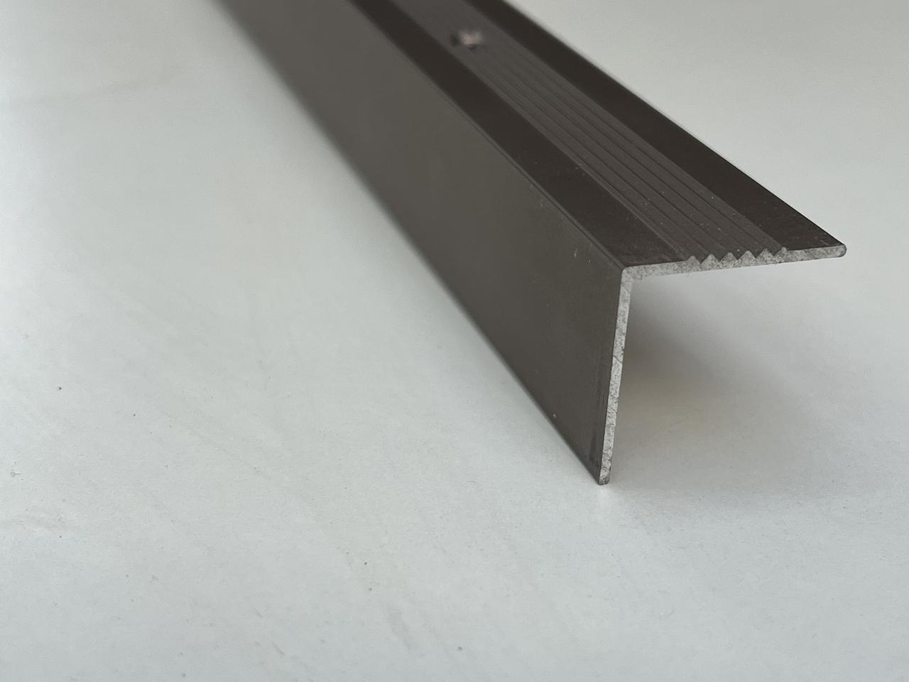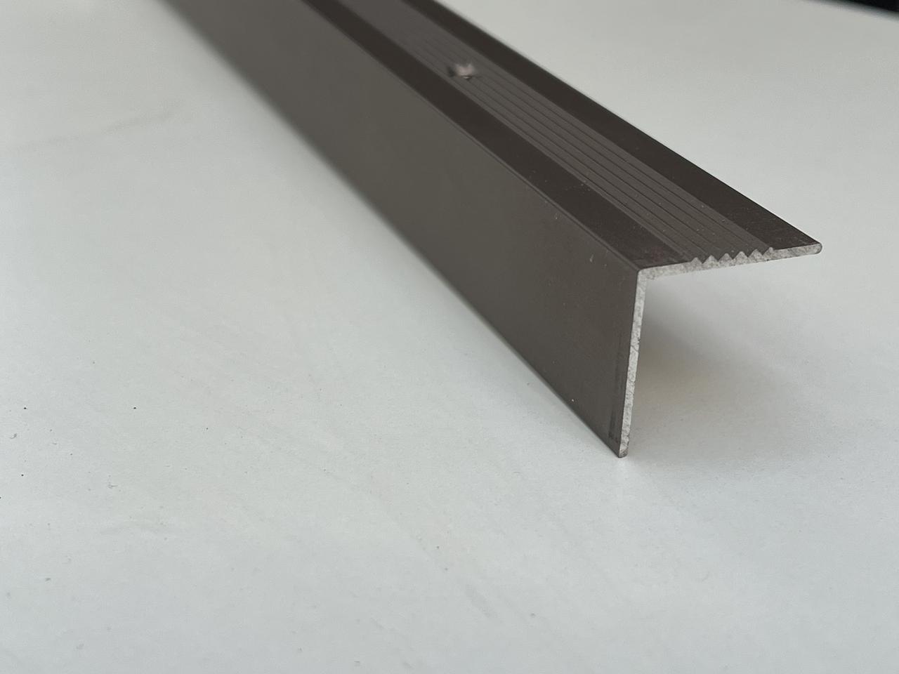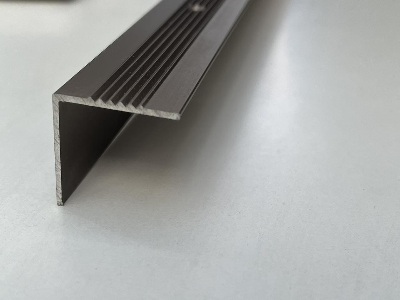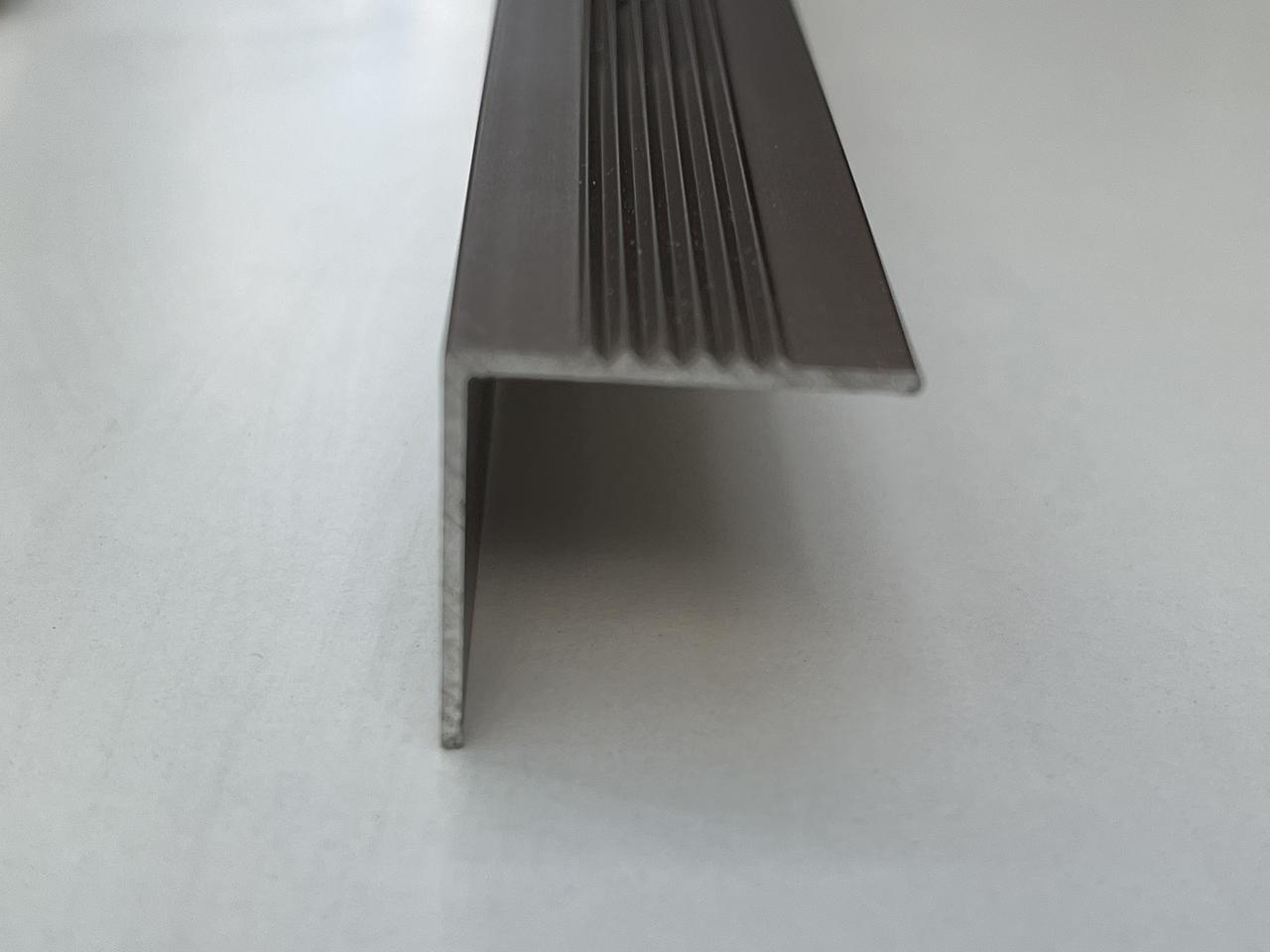 Алюминиевый угловой порог с декоративными насечками, с отверстиями для крепления представляет собой профиль, предназначенный для установки на границе напольных покрытий, имеющих разный уровень стыка.